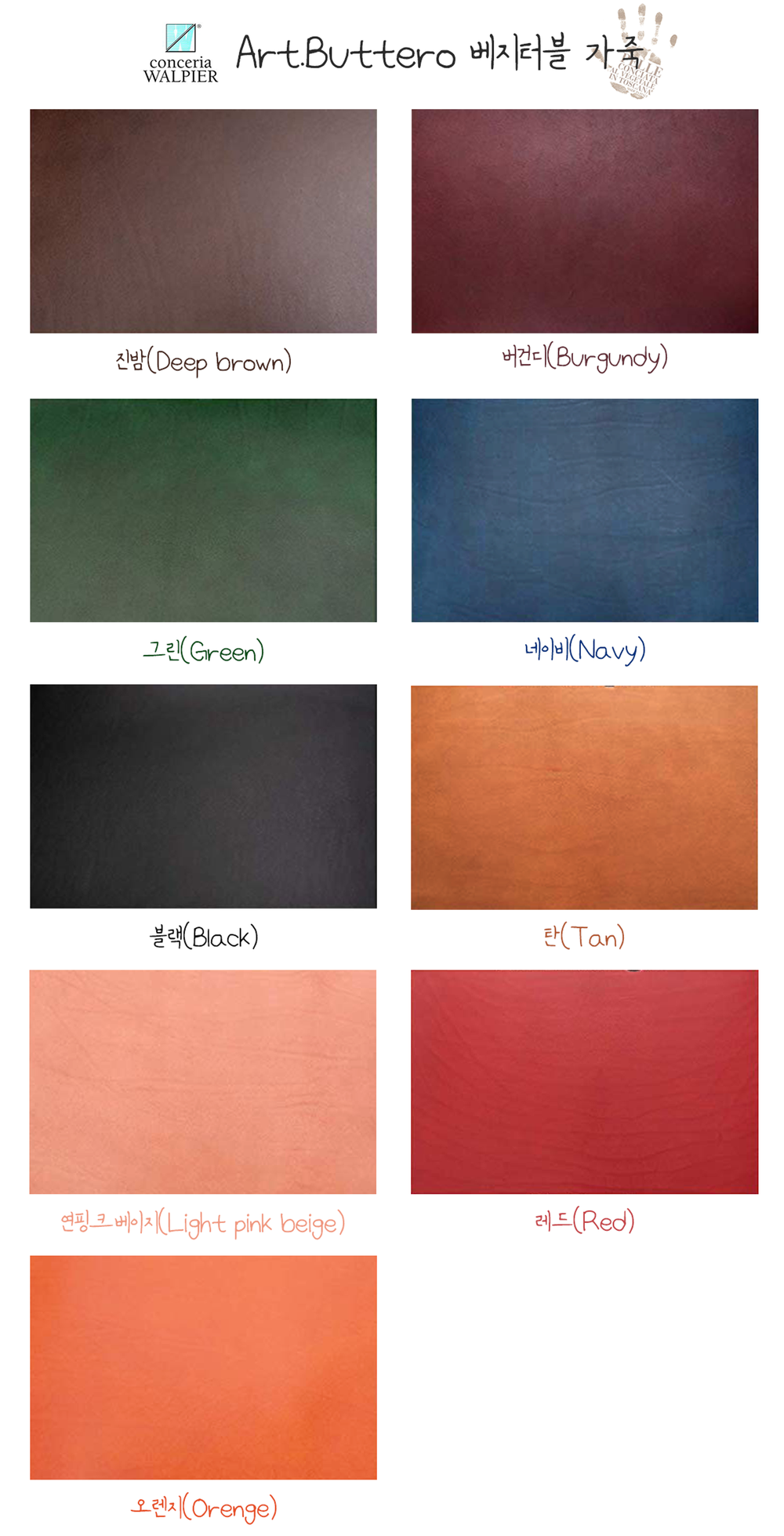 Buttero는 이태리 WALPIER TANNERY 에서 가공 되는 가죽입니다."WALPIER"에서는 100% 프랑스 원피만을 취급하여 가공하는 Tannery로 1973년 회사를 설립하여 3대째 가죽가공을 하고있습니다.VERA PELLE 협회에도 등록되어 있는 Tannery로 전통적인 방식과 오랜 경험에서 나오는 vegetable 가공은 이태리안에서도 최고입니다.Buttero는 가죽 표면에 유분이 많아 베지터블의 약점(burst)을 어느정도 보안한 aticle 이며 프랑스원피(최상급의 원피)을 사용하여 공정단계에서 오일과 약품을 첨가해 vegetable가공하여 조직이 치밀하고 밀도 높으며 표면이 매끄럽고 부드러워 가죽의 본질을 잘 살린 가죽이라고 볼수 있습니다.