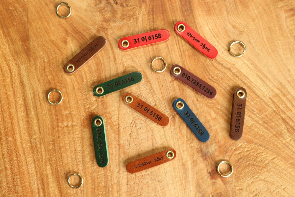 가죽 라벨에 레이저 각인을 통해 원하는 문구나 연락처, 차번호 등을 각인 할 수 있습니다.