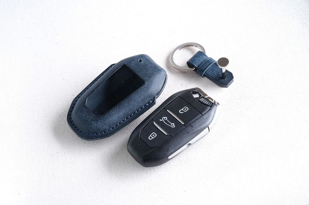 PEOGEOT CITROEN, 푸조 시트로엥 자동차 스마트키 가죽케이스 입니다. 가죽 성형 기법을 통해서 스마트키와 동일한 모양으로 제작하여 맞춤 옷을 입은 듯 스마트키에 딱 맞게 들어가서 안정된 그립감과 핏감을 느낄 수 있습니다. 제작에 사용된 가죽과 부자재는 Art.Pueblo 베지터블 가죽과 국내 제작 고급 도금 부자재 입니다. 특유의 터치감, 색상 발색이 고급스런 푸에블로 가죽과 싸틴처리의 골드와 니켈 장식은 키케이스를 돋보여줄 최고의 조합입니다.