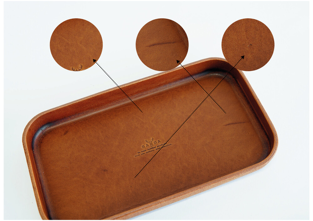 가죽 트레이는 두꺼운 통가죽 원장을 사용해 제작합니다.따라서 가죽의 뒷면은 천연 상태로 제작하게 되는데, 조직에 따라 뒷면의 상처나 혈관자국, 조직의 갈라짐 등이 보일 수 있습니다.